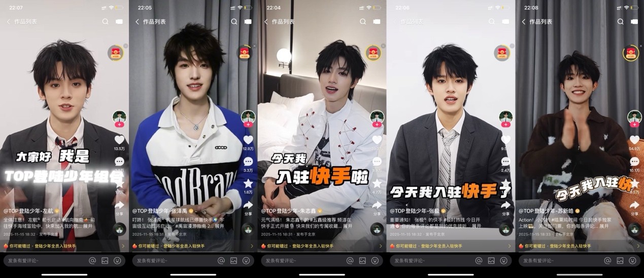 近日,人气少年偶像组合TOP登陆少年又有大动作——组合中的五位成员朱志鑫、张泽禹、张极、左航、苏新皓,个人官方短视频账号正式集体入驻快手平台。这不仅是成员们以个人身份开设的首个短视频账号,更标志着他们与粉丝之间建立了新的专属沟通桥梁,瞬间在全网引发热议,粉丝们纷纷开启狂欢。